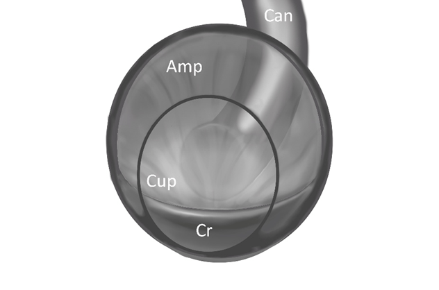 Viewing straight on at the cupula “Cup” , you can see it is an oval attached all around the edge to the ampulla “Amp”. The canal “Can” that contains the crystals in BPPV is pointing at it from the back in this picture. Crystals couldn’t attach to the tip because there is no tip. If they stuck anywhere, it would have to be the middle. They would have to be very sticky indeed to stay on a constantly flexing mat, resisting the pull of gravity.